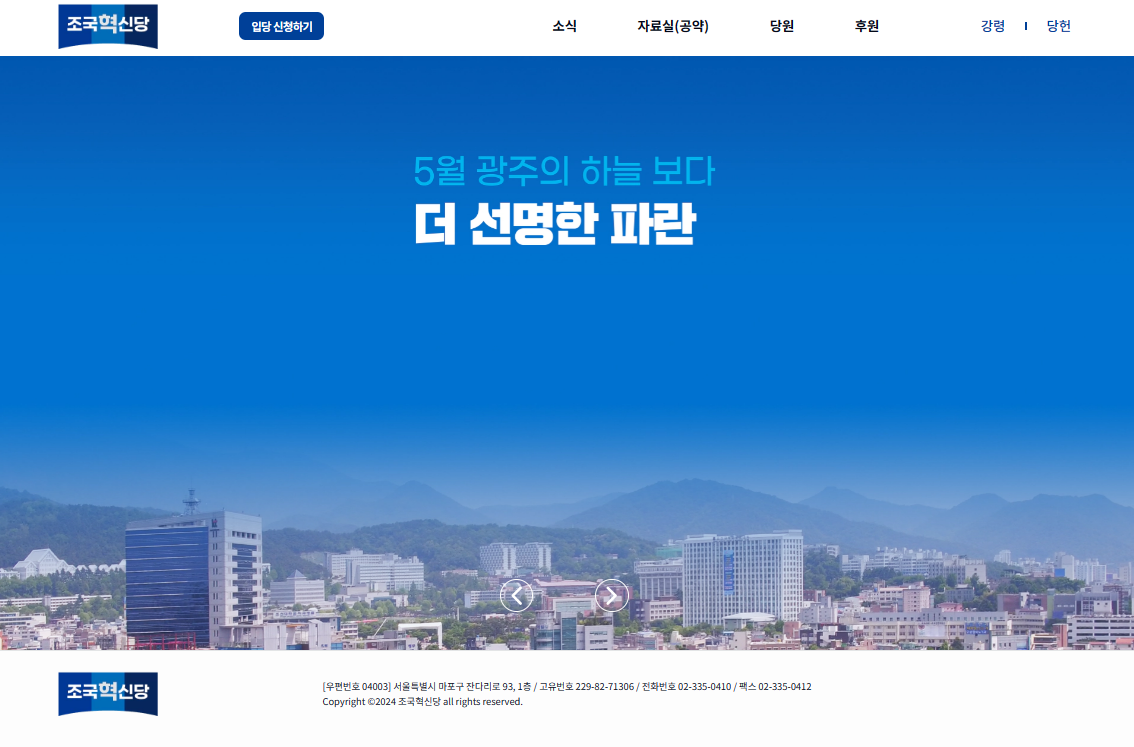 현재 조국혁신당 홈페이지는 '조국신당.kr'을 검색하면 조국혁신당 홈페이지가 활성화 되어 가입이 가능합니다. 현재 홈페이지를 계속해서 업데이트 중에 있으나, 이전 임시 홈페이지에는 없었던 당원, 후원, 강령, 당헌 등의 항목이 생겼습니다.